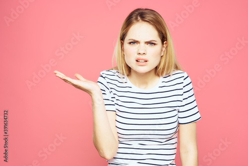 Blonde striped t-shirt emotion gesture hands displeased facial expression pink background