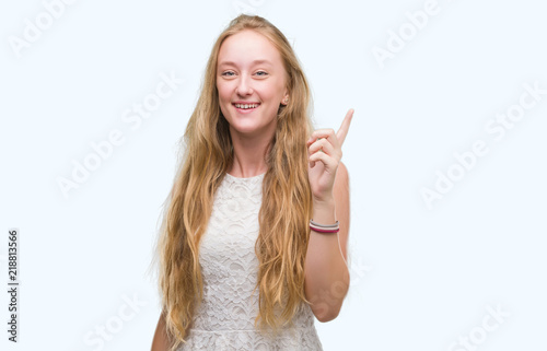 Blonde teenager woman surprised with an idea or question pointing finger with happy face, number one