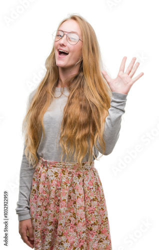 Blonde teenager woman wearing flowers skirt showing and pointing up with fingers number five while smiling confident and happy.