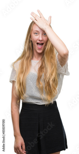 Blonde teenager woman wearing moles shirt surprised with hand on head for mistake, remember error. Forgot, bad memory concept.
