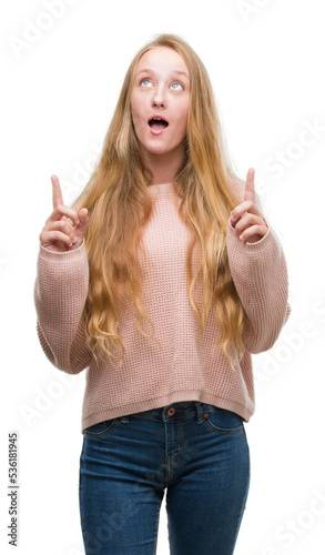Blonde teenager woman wearing pink sweater amazed and surprised looking up and pointing with fingers and raised arms.