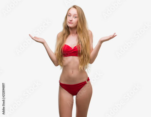 Blonde teenager woman wearing red bikini clueless and confused expression with arms and hands raised. Doubt concept.