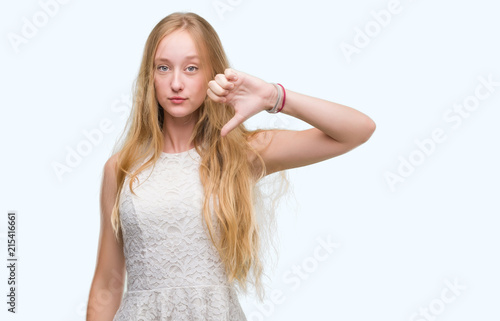 Blonde teenager woman with angry face, negative sign showing dislike with thumbs down, rejection concept