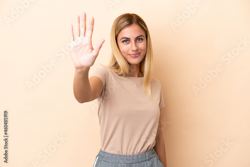 Blonde Uruguayan girl isolated on beige background counting five with fingers