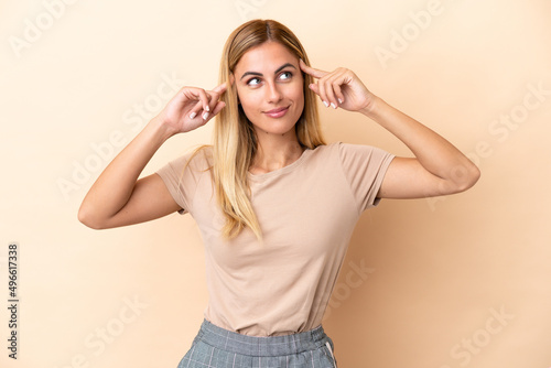 Blonde Uruguayan girl isolated on beige background having doubts and thinking