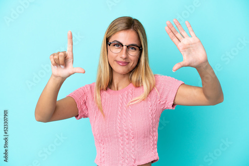 Blonde Uruguayan girl isolated on blue background counting seven with fingers