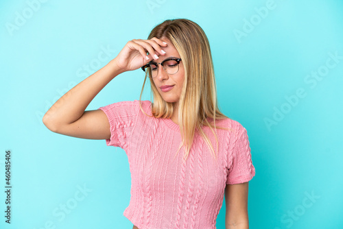 Blonde Uruguayan girl isolated on blue background with tired and sick expression