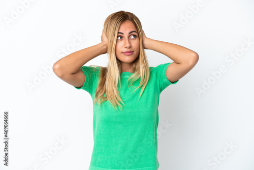 Blonde Uruguayan girl isolated on white background frustrated and covering ears
