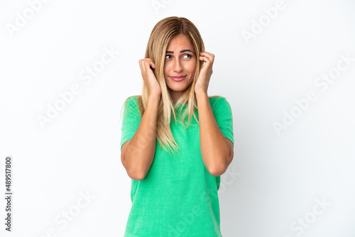 Blonde Uruguayan girl isolated on white background frustrated and covering ears