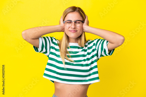 Blonde Uruguayan girl isolated on yellow background frustrated and covering ears