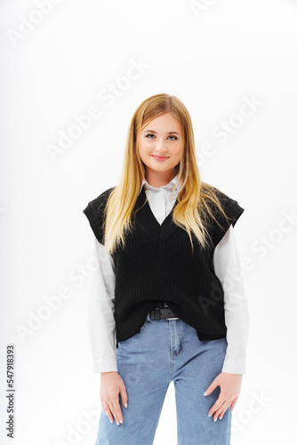 blonde with sequins on face in jeans and a black knitted vest. white background.