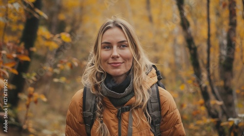 Blonde Woman Hiking Through a Vibrant Autumn Forest Trail