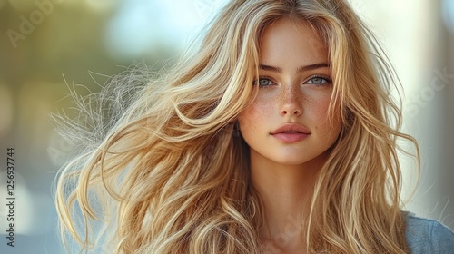 Blonde woman, outdoors, windblown hair, summer, beauty