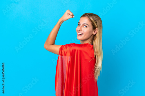 Blonde woman over isolated background in superhero costume and doing strong gesture