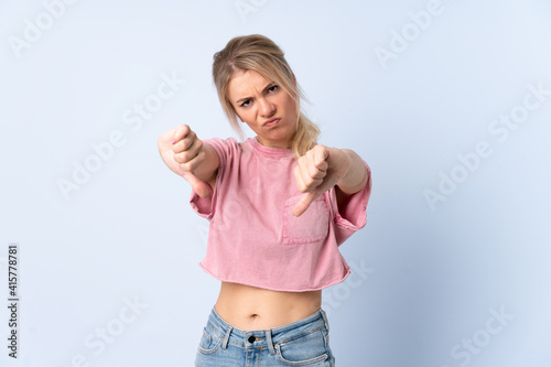 Blonde woman over isolated blue background showing thumb down with two hands