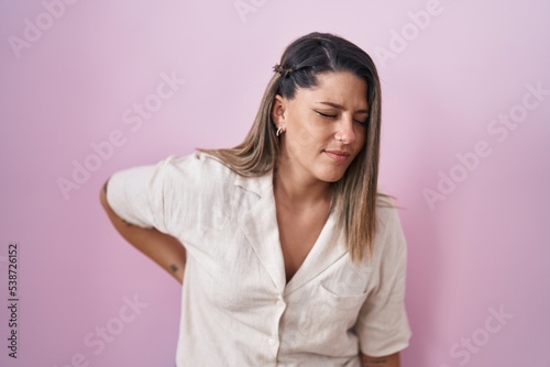 Blonde woman standing over pink background suffering of backache, touching back with hand, muscular pain