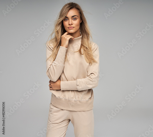 Blonde woman wear of beige set of tracksuit isolated on grey background