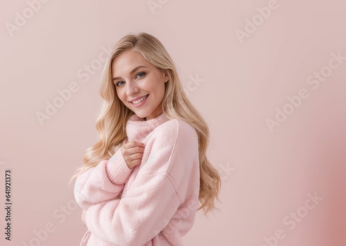 blonde woman wearing casual winter clothing over pink background Hugging one self happy and positive, smiling confident. Self love and self care