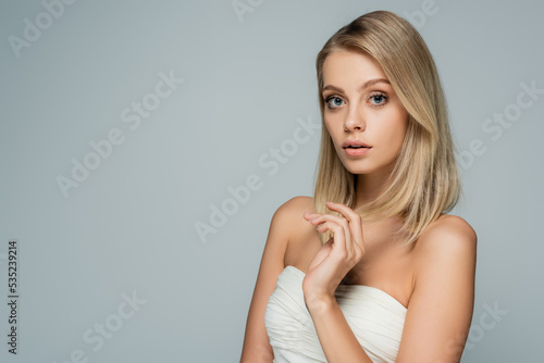 blonde woman with bare shoulders and natural makeup looking at camera isolated on grey.