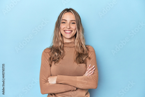 Blonde young caucasian woman in blue studio who feels confident, crossing arms with determination.