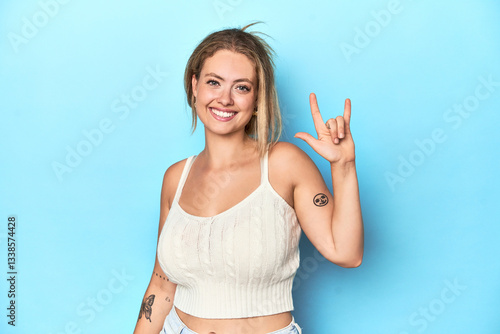 Blonde young woman in white top on blue background showing a horns gesture as a revolution concept.
