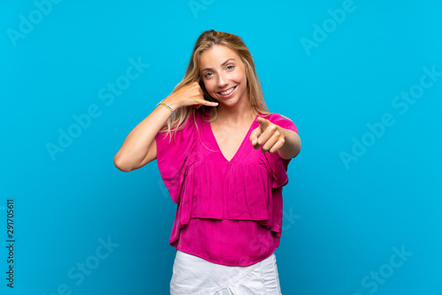 Blonde young woman over isolated blue background making phone gesture and pointing front
