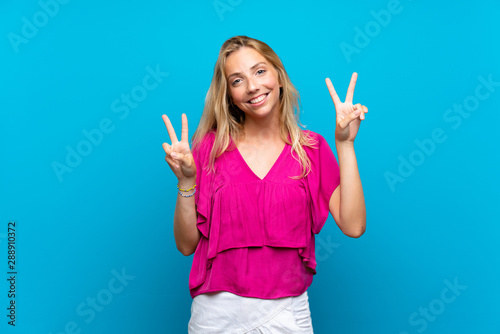 Blonde young woman over isolated blue background showing victory sign with both hands