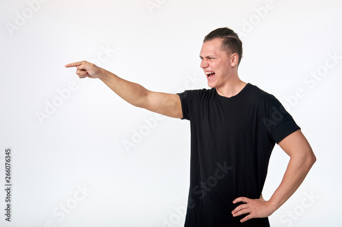Body language. Men's domination. Angry aggressive young man screaming and pointing at you.