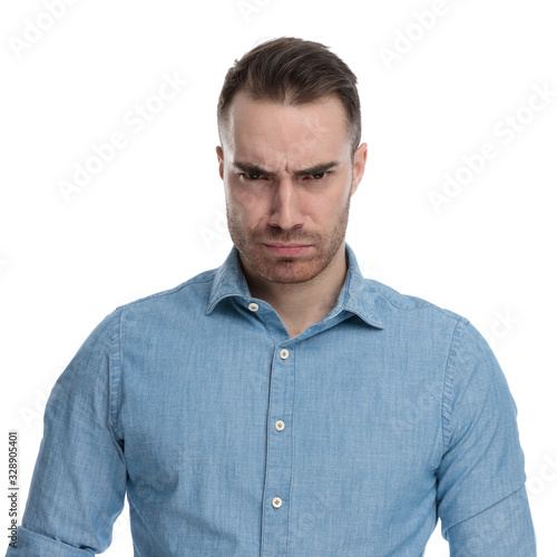 Bothered casual man looking forward and frowning