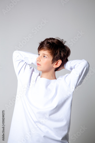 boy in white sports long sleeve t-shirt