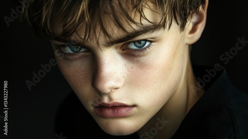 Boy with piercing blue eyes, soft light, minimal backdrop, conveying quiet introspection.
