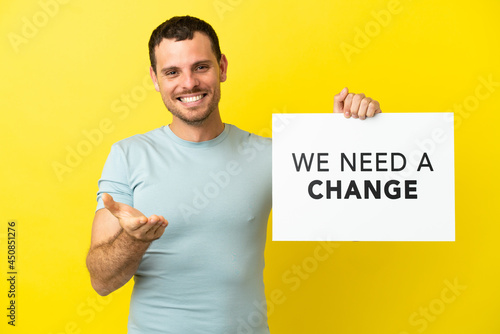 Brazilian man over isolated purple background holding a placard with text We Need a Change making a deal