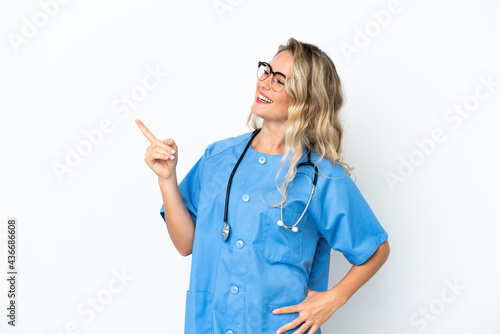 Brazilian surgeon doctor woman over isolated background pointing finger to the side and presenting a product