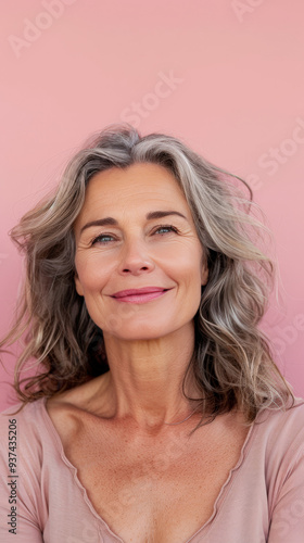 Breast Cancer Awareness: Middle-Aged Woman Smiling Confidently on Pink Background