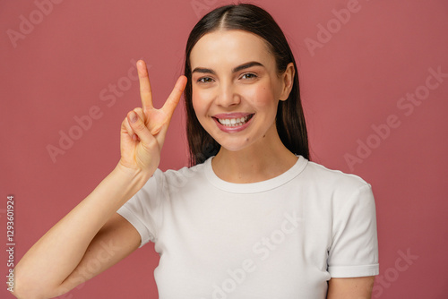 Bright and cheerful person making a peace hand gesture while smiling on a pink backdrop.