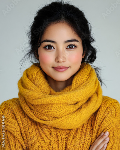 Bright portrait of a young woman wearing a cozy yellow sweater and scarf indoors