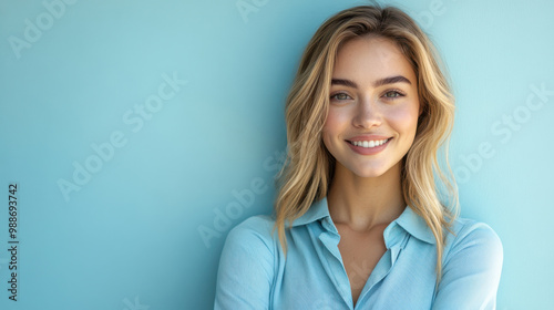 Bright portrait of blonde woman confidently smiling in front of blue wall, wearing a casual light blue shirt, simple and modern aesthetic, fresh and clean look