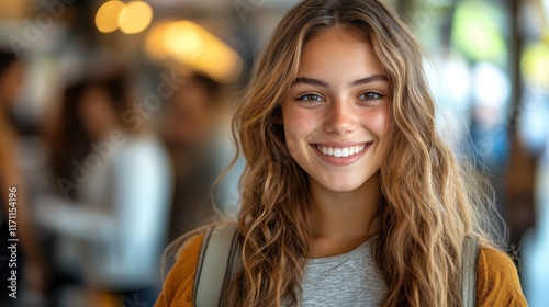 Bright smile of a young girl in a vibrant urban setting with a blurred background filled with people engaging in various activities