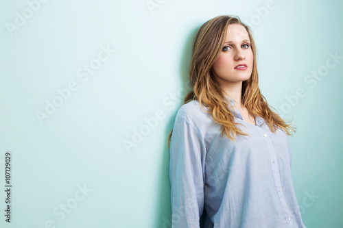 Bright young blond girl is smiling and posing against the cyan wall