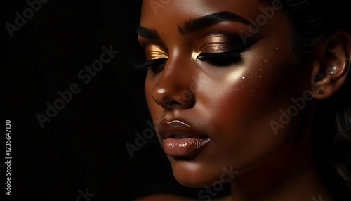 brown latina girl on black background, gold makeup, gold flakes, full lips brown, model, gold eyeshadow, gold brush strokes