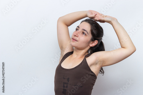 Brown tank top woman on white background with tied hair stretching