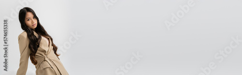 brunette asian woman in fashionable blazer looking at camera isolated on grey, banner.