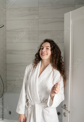 Brunette beauty wearing white bathrobe coming just from the bathroom
