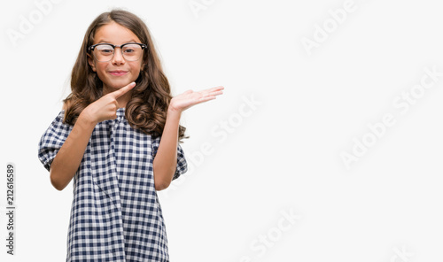Brunette hispanic girl wearing glasses very happy pointing with hand and finger
