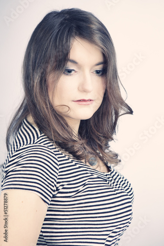 Brunette in stripes posing for studio portrait