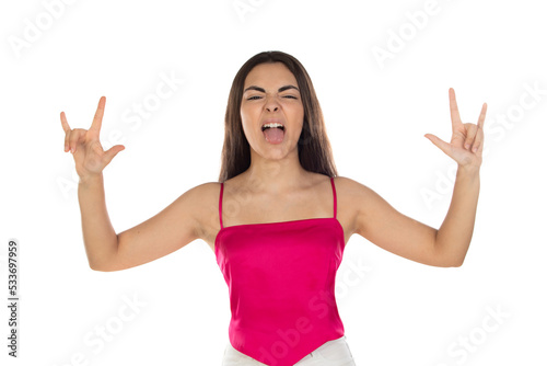 Brunette rebel teenager girl showing rock gesture with fingers wearing pink top