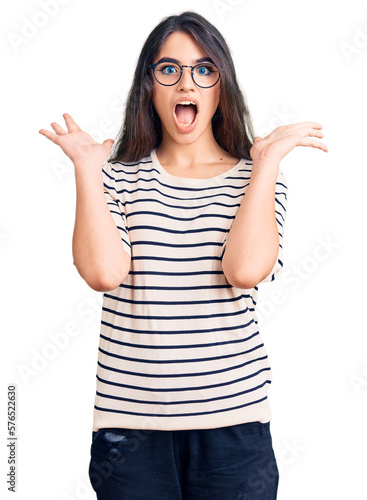 Brunette teenager girl wearing casual clothes and glasses celebrating crazy and amazed for success with arms raised and open eyes screaming excited. winner concept