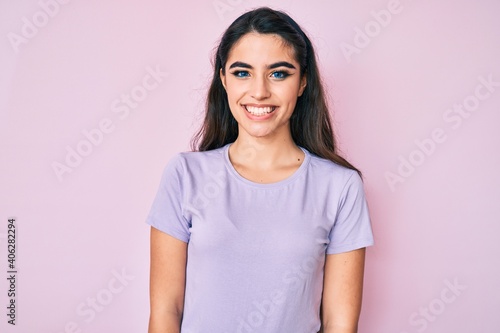 Brunette teenager girl wearing casual clothes looking positive and happy standing and smiling with a confident smile showing teeth