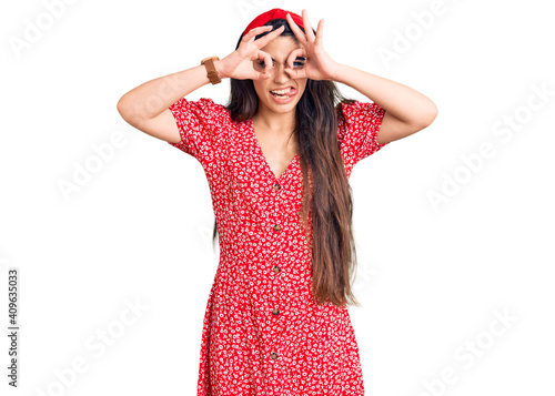 Brunette teenager girl wearing summer dress doing ok gesture like binoculars sticking tongue out, eyes looking through fingers. crazy expression.