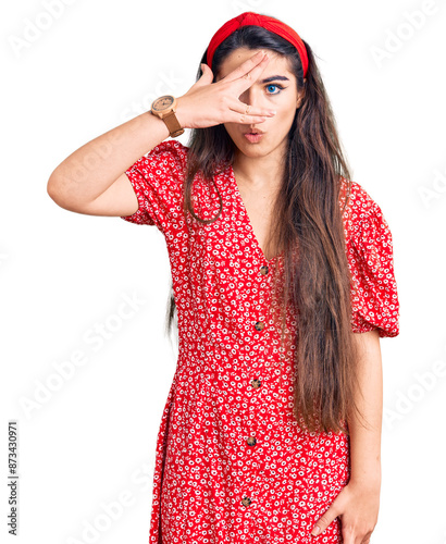 Brunette teenager girl wearing summer dress peeking in shock covering face and eyes with hand, looking through fingers with embarrassed expression.